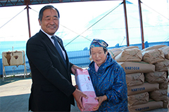 そんな状況下で米を初出荷したのは田浦地区の奥村義正さんだ。JAむかわ営農部の民間検査員高橋陽二販売次長の検査で、出荷した「ゆめぴりか」336袋(30kg)が全量1等低蛋白米となった。清野秀明営農部長は「震災でセレモニーは中止しようとも考えたが、前を向いていかなければと、祝いの日を迎えた」とはじめに挨拶した。震災を乗り越え出荷した奥村喜代子さんにむかわ町渋谷昌彦副町長は「米処むかわで頑張って初出荷できたことは明るい話題。全量1等米おめでとう」と祝福。JAむかわ長門組合長は「震災の中でも無事に収穫出荷できる喜びはひとしお。これから出荷する生産者も新たな気持ちで取り組んでもらいたい」と激励と期待を込めた。1等米初出荷を記念して奥村さんと関係者が笑顔で記念撮影をした。毎年初出荷で1等米の奥村さんは、今年も4ヘクタールすべて「ゆめぴりか」を作付した。「天候不順と収穫前に台風、震災と心配したけれど、収量は例年より少ないけれど、出荷できて嬉しい」と話した。高橋次長は「開花時期も大幅に遅れ、台風、地震の災害があったが収穫期を迎えることができた。刈り取り適期や調整指導に万全を期し、品質、低蛋白米出荷を期待している」と話した。
